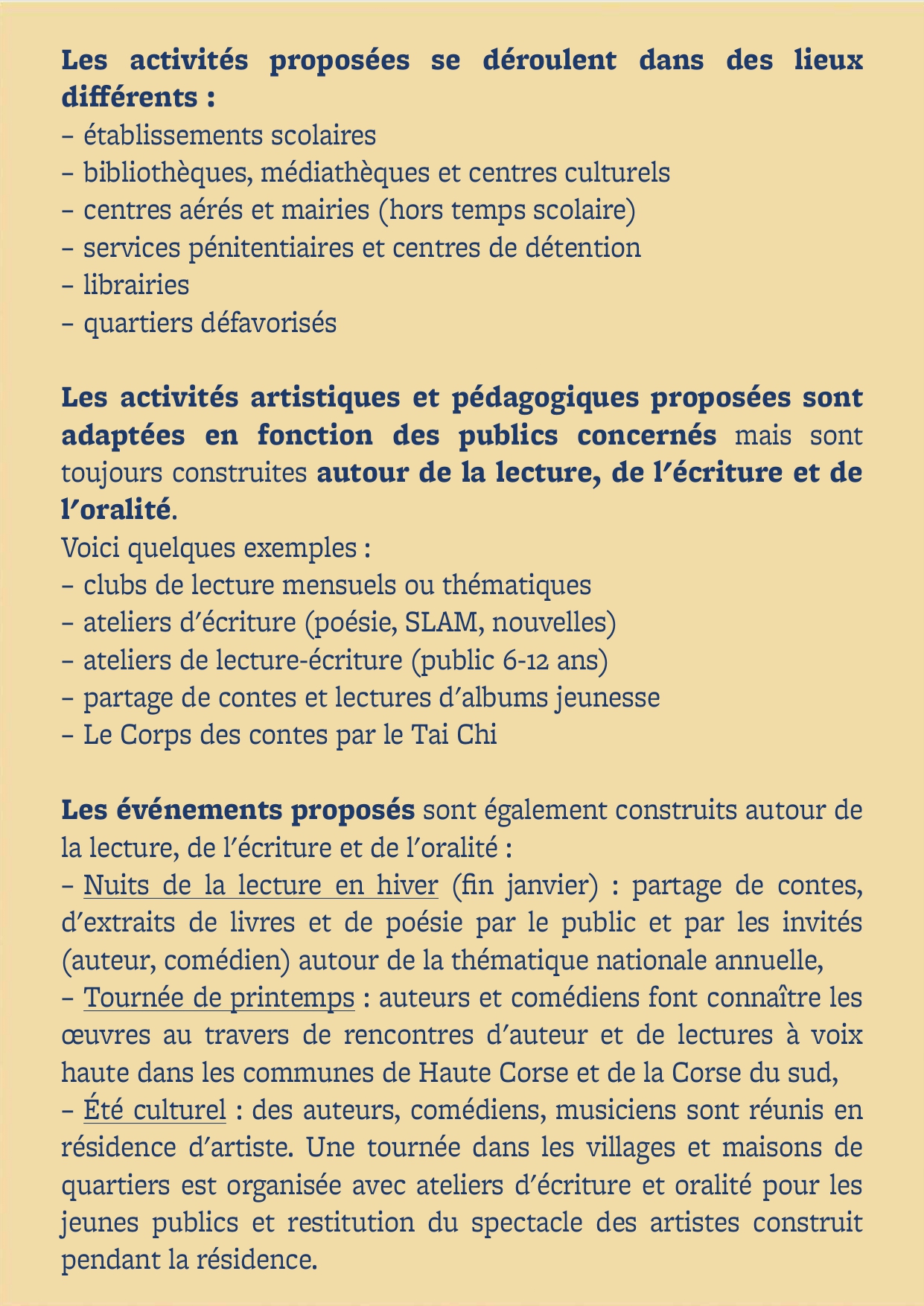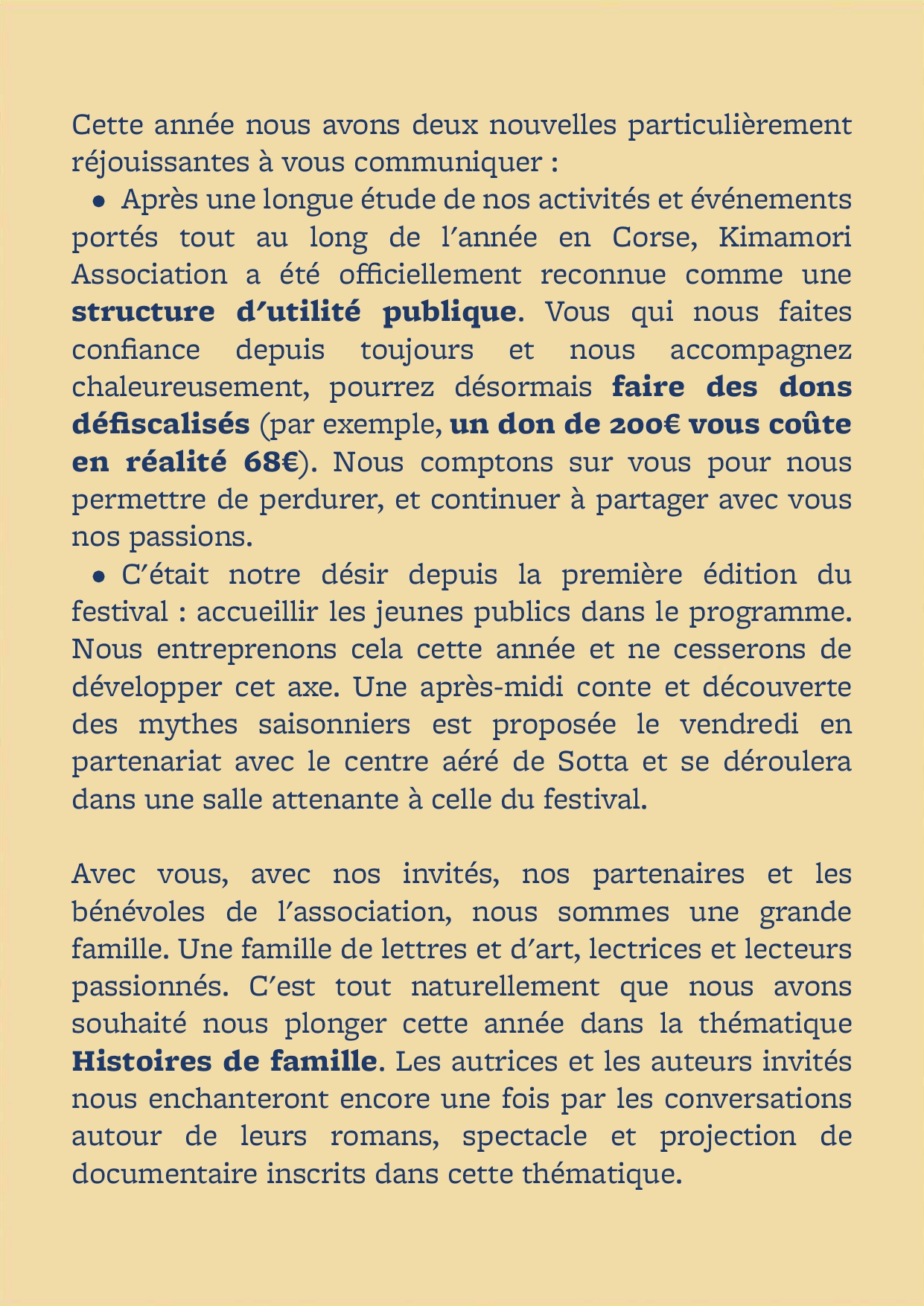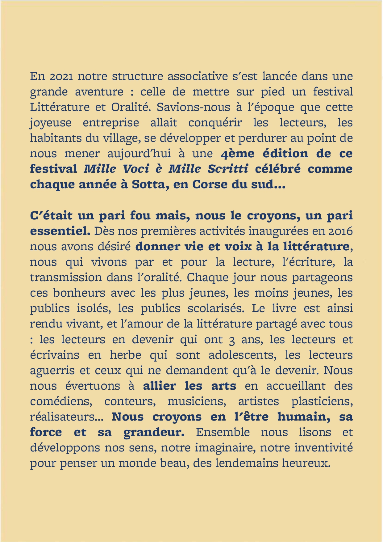 Nous avons souhaité donner voix à la littérature, en résonance avec les autres arts, et la faire vivre dans le partage avec le public corse, et dans le territoire. Nous désir est de voir vivre et revivre une approche ancestrale et intemporelle des lettres et des arts, celle qui porte de la magie dans les instants vécus et dans l'échange. Vous savez, celle qui pose des traces indélébiles en chacun de nous et dans l'imaginaire collectif, celle qui donne des ailes à l'Homme pour réinventer le monde, en faire un lieu de paix et de partage favorable aux vivants toutes espèces confondues.
