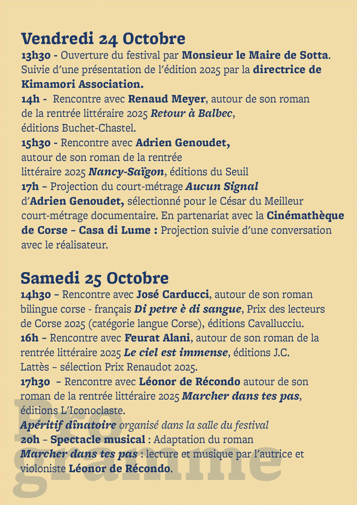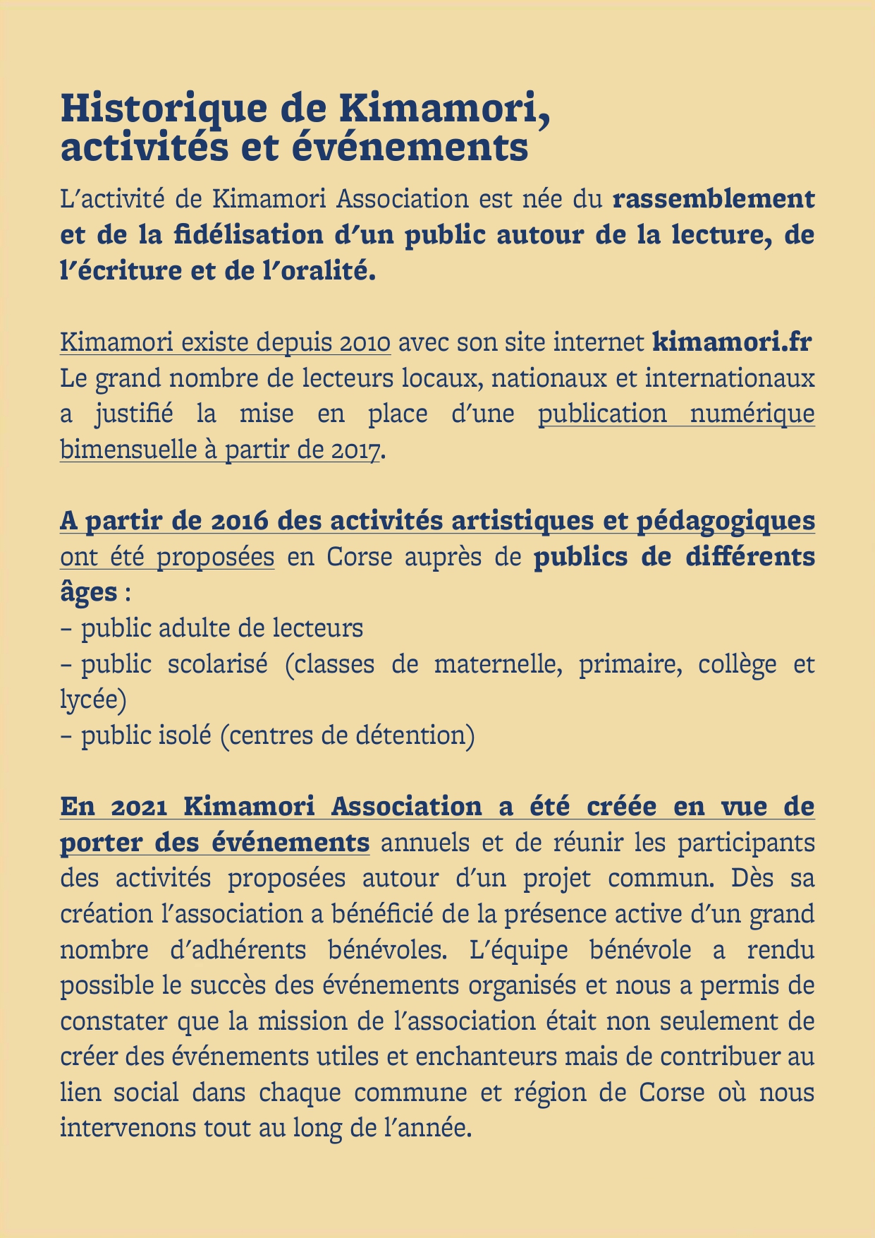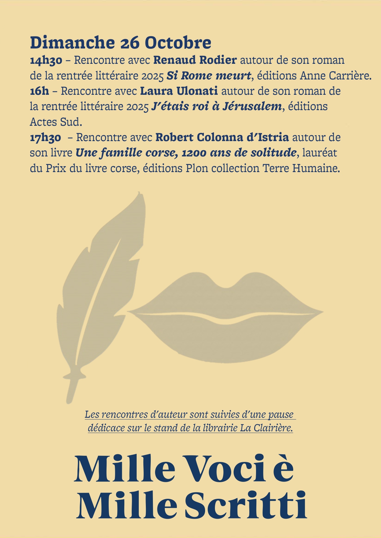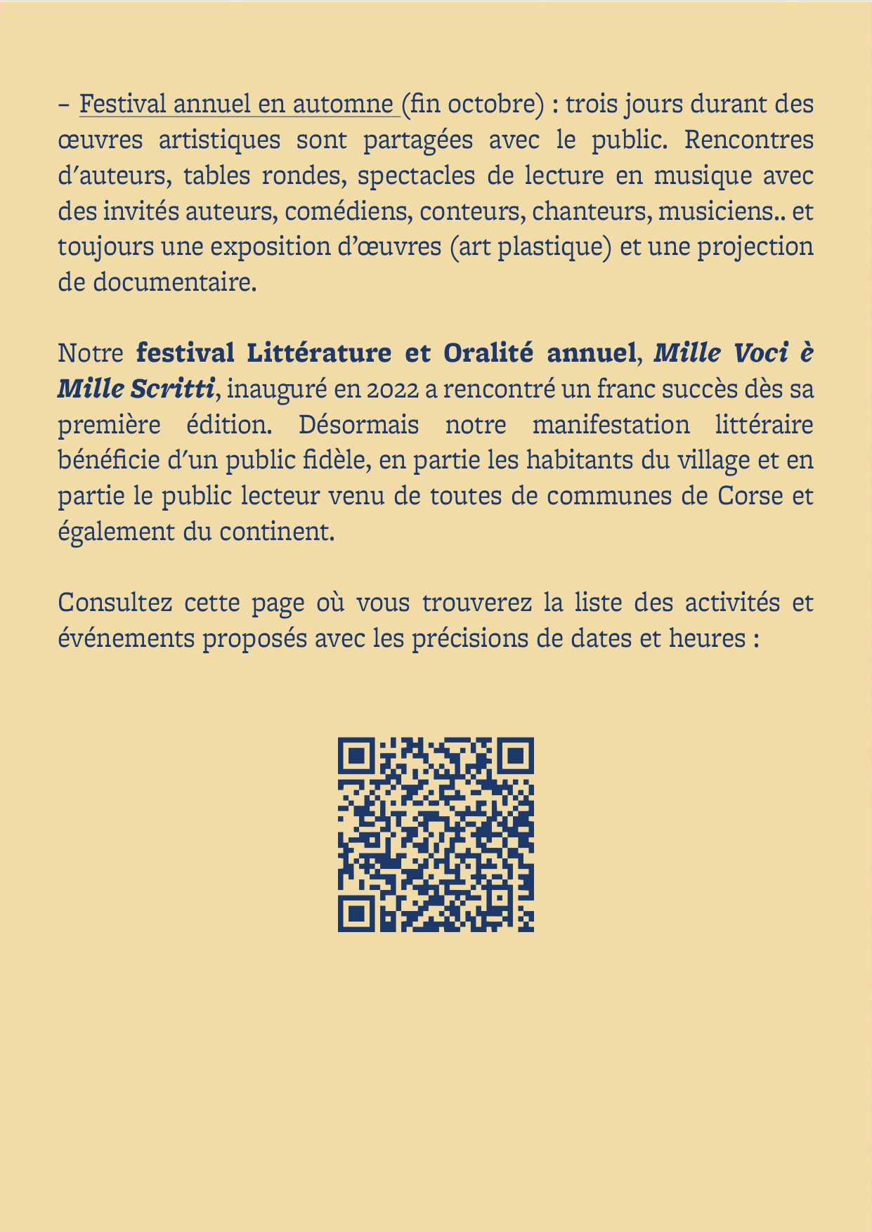 Nous avons souhaité donner voix à la littérature, en résonance avec les autres arts, et la faire vivre dans le partage avec le public corse, et dans le territoire. Nous désir est de voir vivre et revivre une approche ancestrale et intemporelle des lettres et des arts, celle qui porte de la magie dans les instants vécus et dans l'échange. Vous savez, celle qui pose des traces indélébiles en chacun de nous et dans l'imaginaire collectif, celle qui donne des ailes à l'Homme pour réinventer le monde, en faire un lieu de paix et de partage favorable aux vivants toutes espèces confondues.
